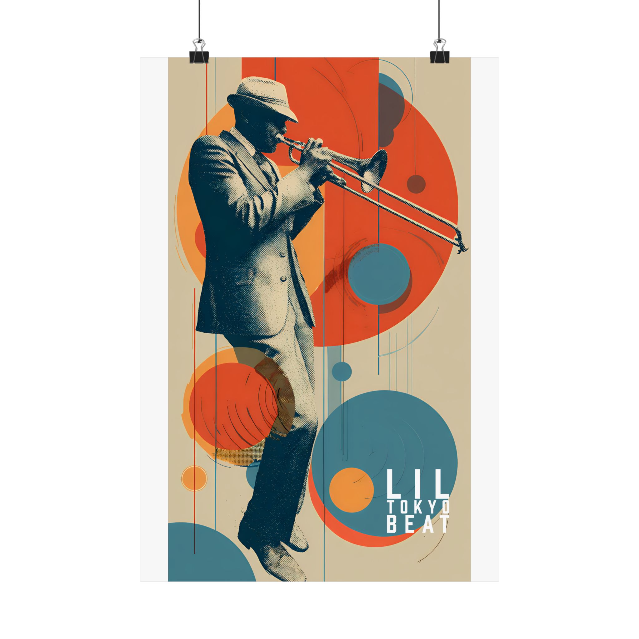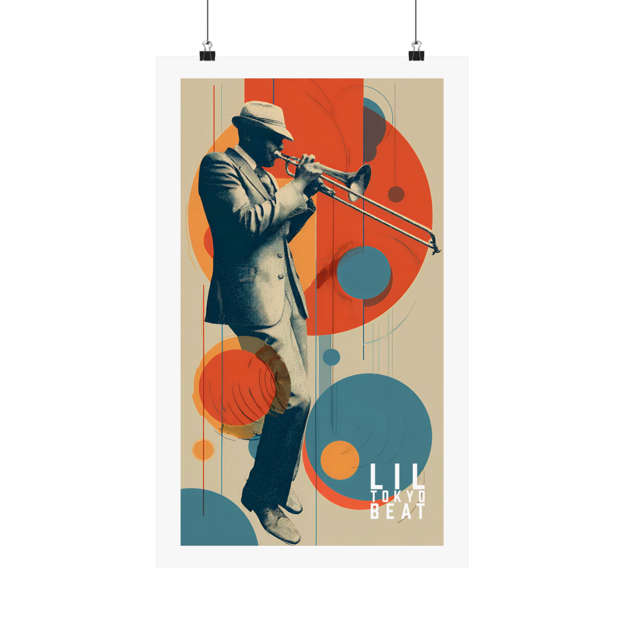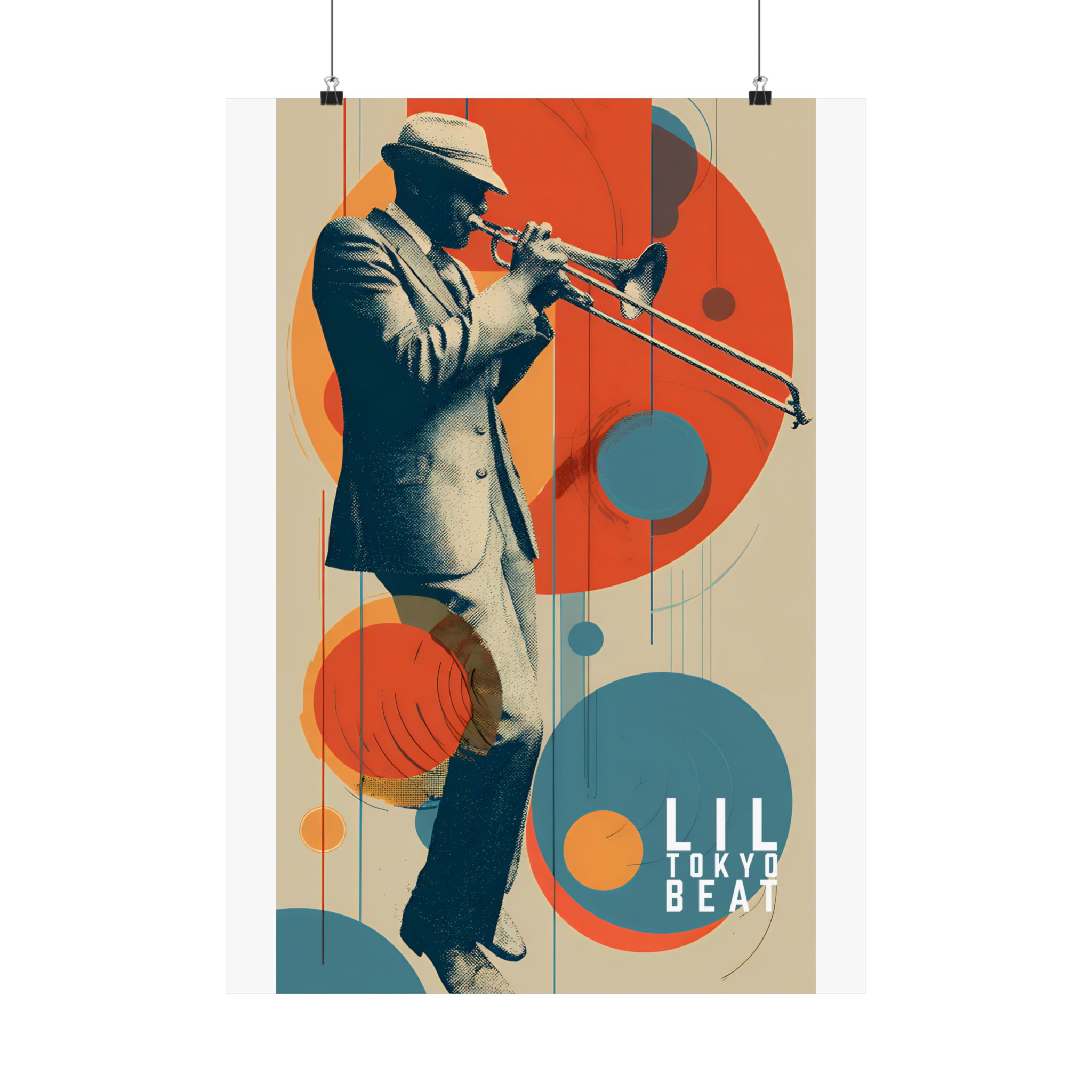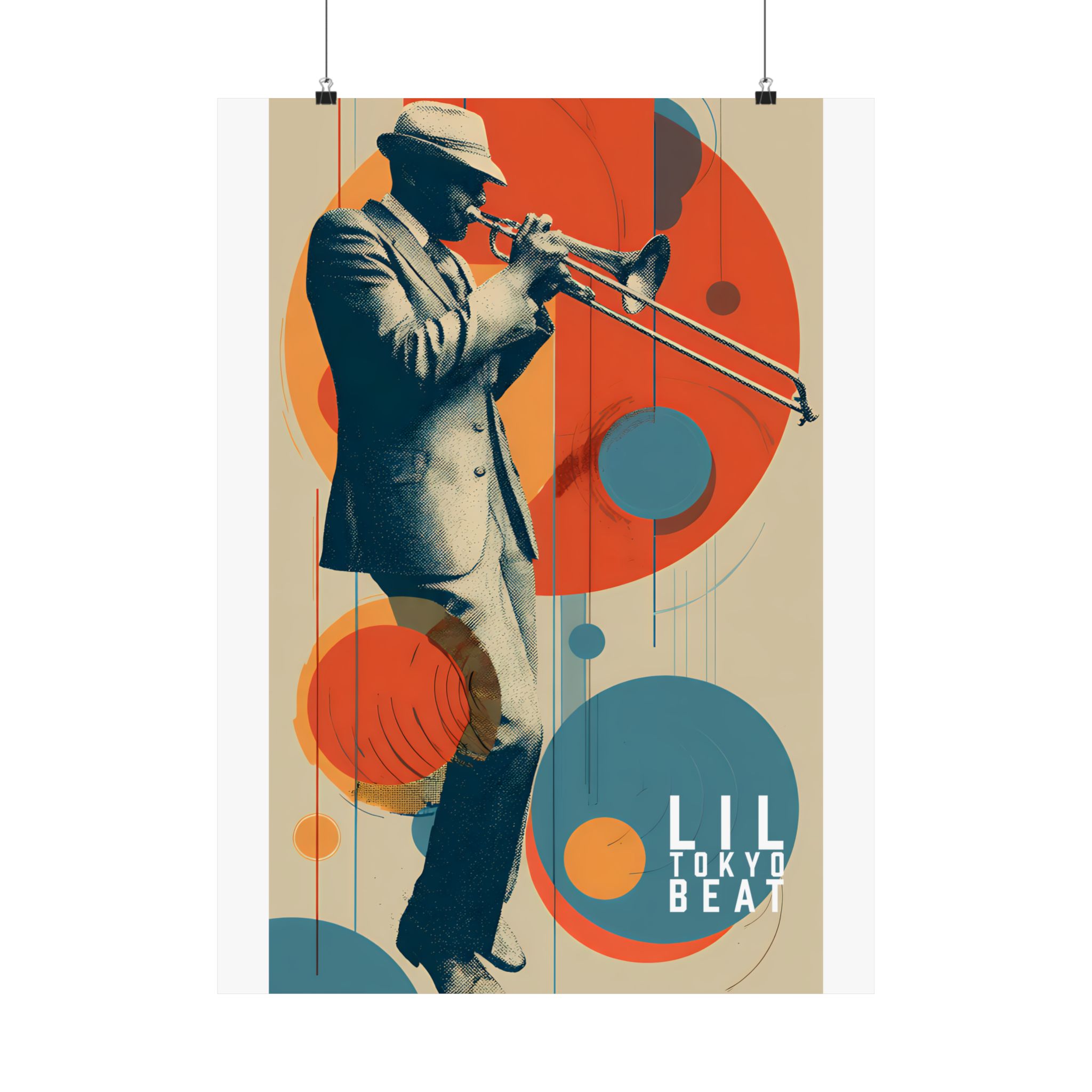 Bring timeless jazz energy into your space with this striking trombone poster from Lil Tokyo Beat. Featuring a stylish jazz musician in motion against bold abstract circles and modern retro color blocks, this artwork captures rhythm, swing, and late-night club atmosphere. The blend of vintage jazz aesthetics and contemporary graphic design makes this poster perfect for music rooms, living spaces, studios, offices, lounges, and creative interiors. Designed for jazz lovers, musicians, and modern art collectors, this piece adds movement, culture, and sophisticated style to any wall. True to Lil Tokyo Beat’s K.A.T. identity — Kool, Artful, Timeless — this poster transforms classic jazz spirit into modern wall decor and represents a new voice in music-inspired art.