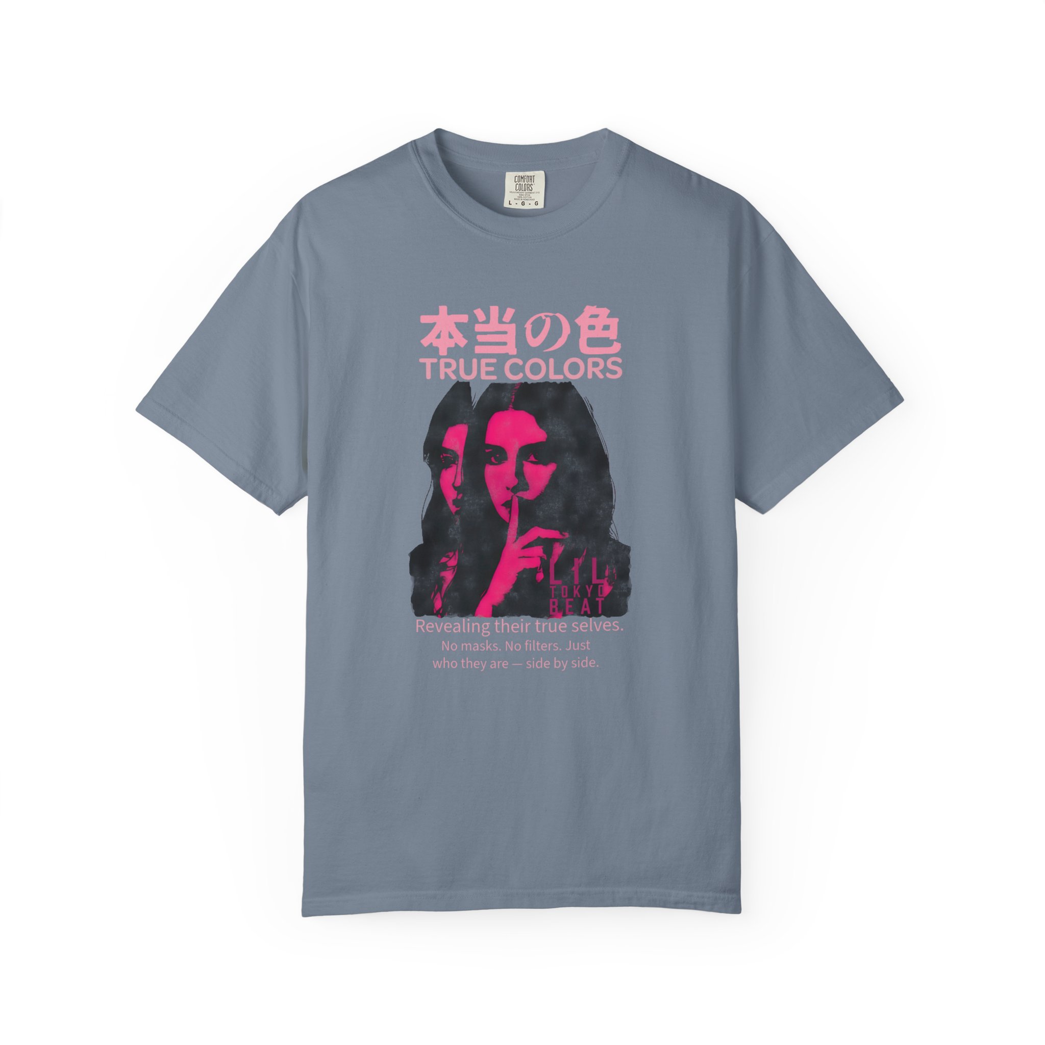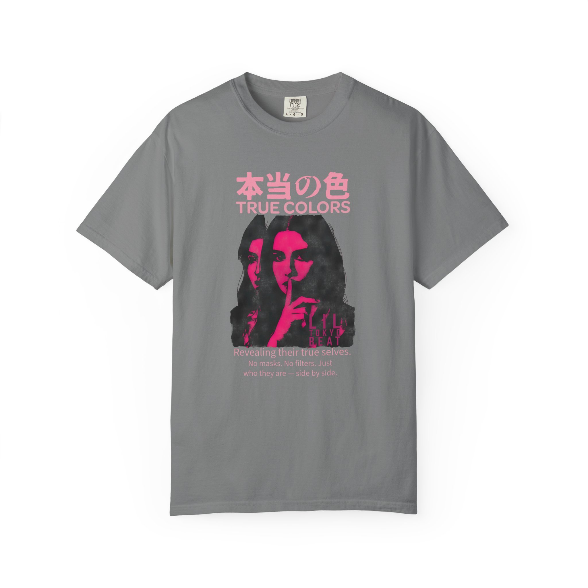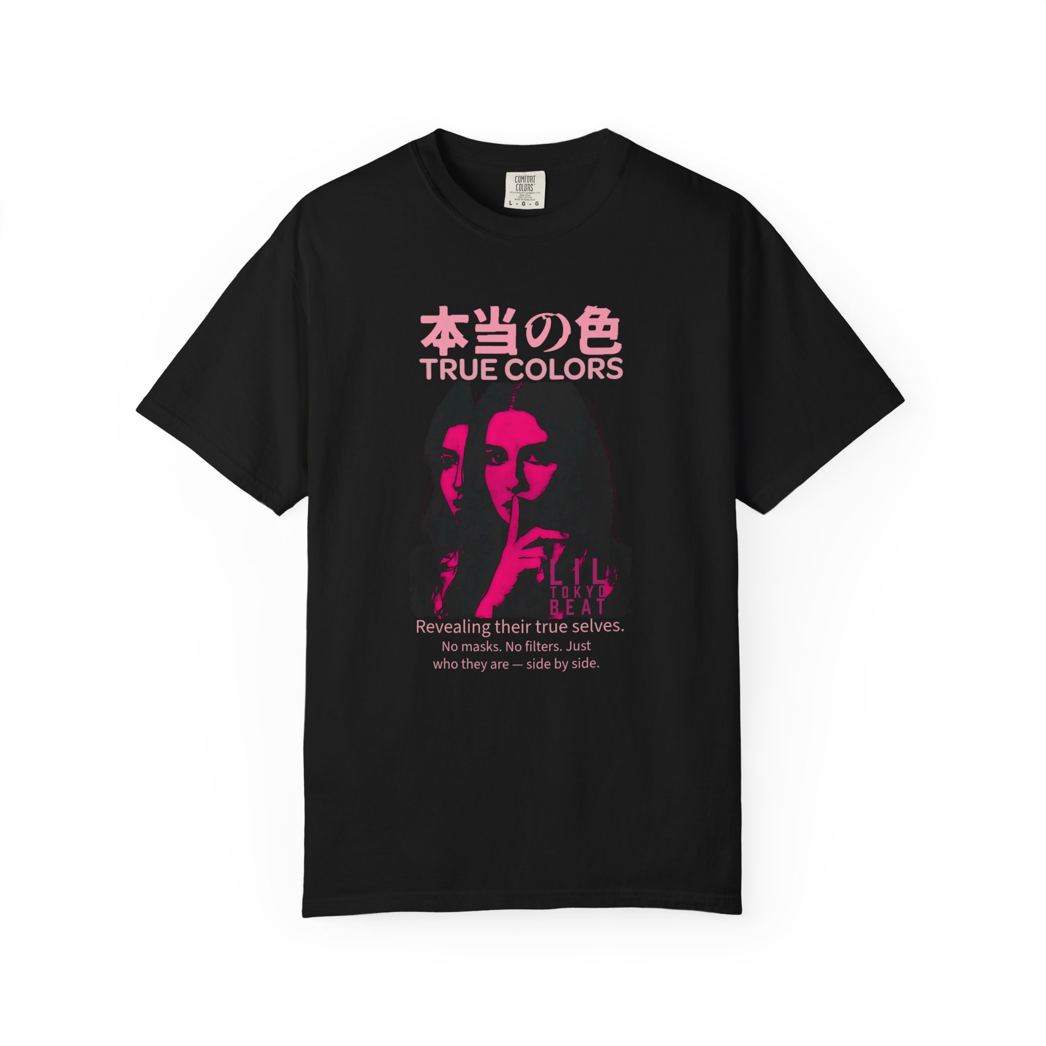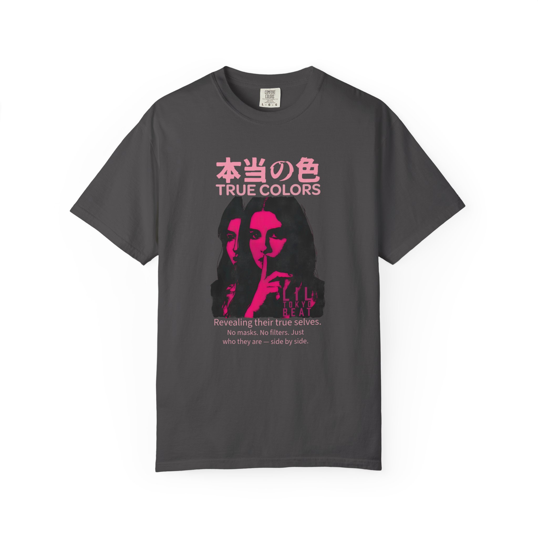 Reveal your style and your truth with this Lil Tokyo Beat TRUE COLORS graphic tee. Featuring two women in shades of pink and black, each holding a finger to their lips in a striking “shh” gesture, the design is paired with Japanese text and the bold statement: “Revealing their true selves. No masks. No filters. Just who they are — side by side.” Printed on a dark gray shirt, this piece blends Japanese streetwear aesthetics with a modern message of authenticity. Perfect for fashion lovers, creatives, and anyone who values self-expression. Soft, comfortable, and versatile—wear it as a bold statement or as part of your everyday street style. Product features – Available in sizes S to 4XL for the perfect fit – Double-needle stitching for durability – Garment-dyed fabric for a soft texture – Made with 100% US cotton for long-lasting comfort – Available in 58 colors to choose from Care instructions – Machine wash: cold (max 30C or 90F) – Do not bleach – Tumble dry: low heat – Iron, steam or dry: low heat – Do not dryclean