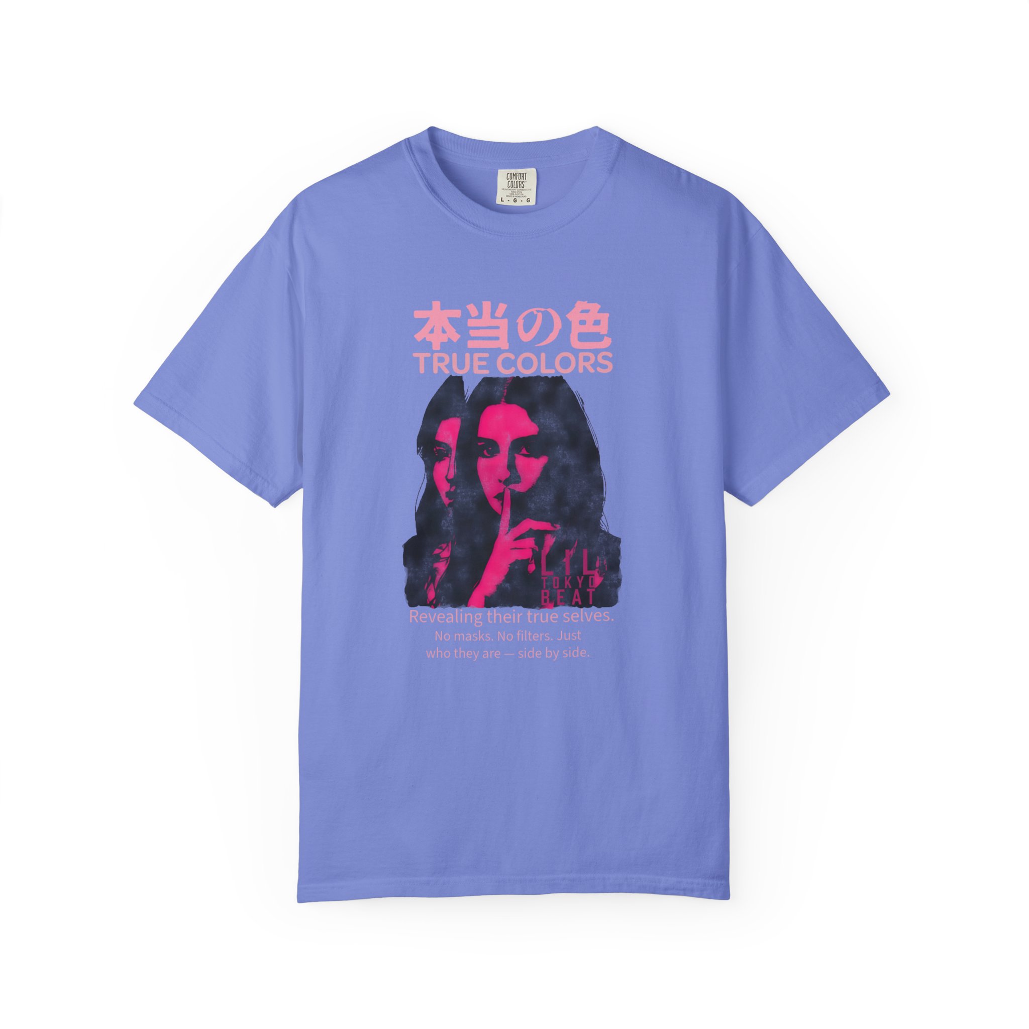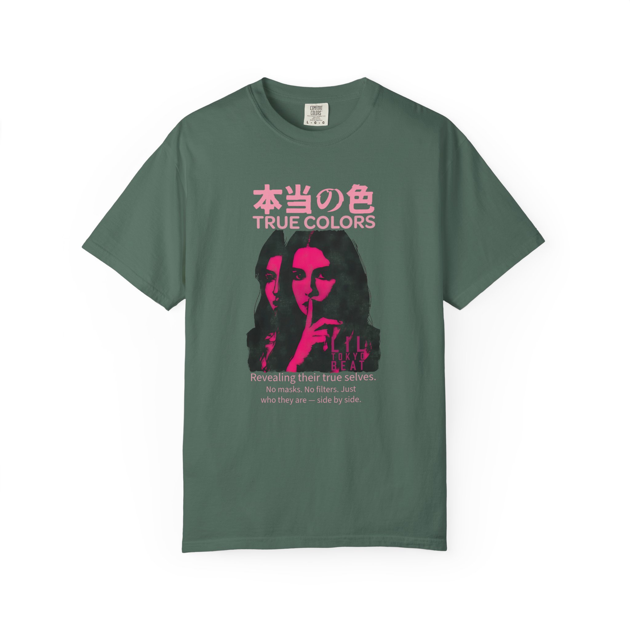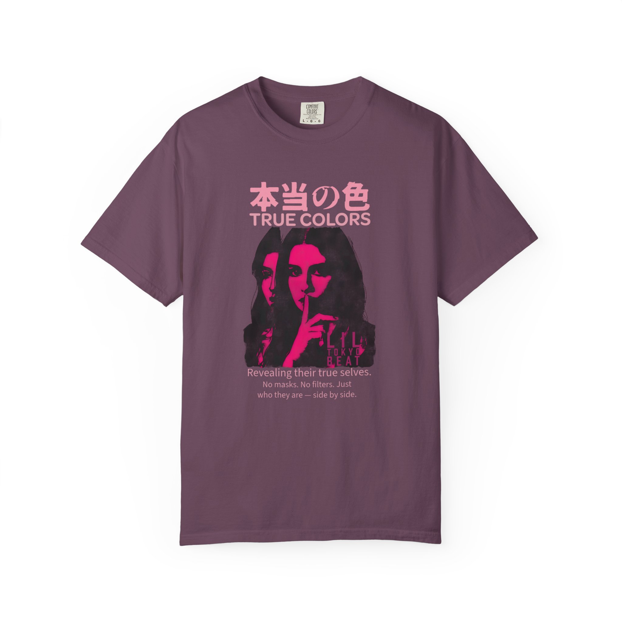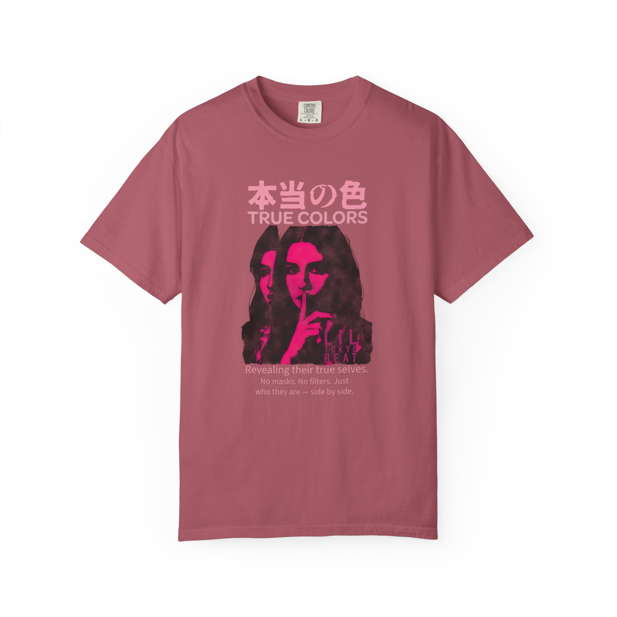 Reveal your style and your truth with this Lil Tokyo Beat TRUE COLORS graphic tee. Featuring two women in shades of pink and black, each holding a finger to their lips in a striking “shh” gesture, the design is paired with Japanese text and the bold statement: “Revealing their true selves. No masks. No filters. Just who they are — side by side.” Printed on a dark gray shirt, this piece blends Japanese streetwear aesthetics with a modern message of authenticity. Perfect for fashion lovers, creatives, and anyone who values self-expression. Soft, comfortable, and versatile—wear it as a bold statement or as part of your everyday street style. Product features – Available in sizes S to 4XL for the perfect fit – Double-needle stitching for durability – Garment-dyed fabric for a soft texture – Made with 100% US cotton for long-lasting comfort – Available in 58 colors to choose from Care instructions – Machine wash: cold (max 30C or 90F) – Do not bleach – Tumble dry: low heat – Iron, steam or dry: low heat – Do not dryclean