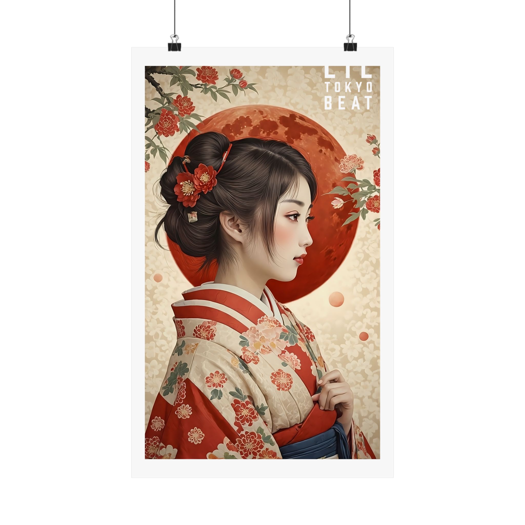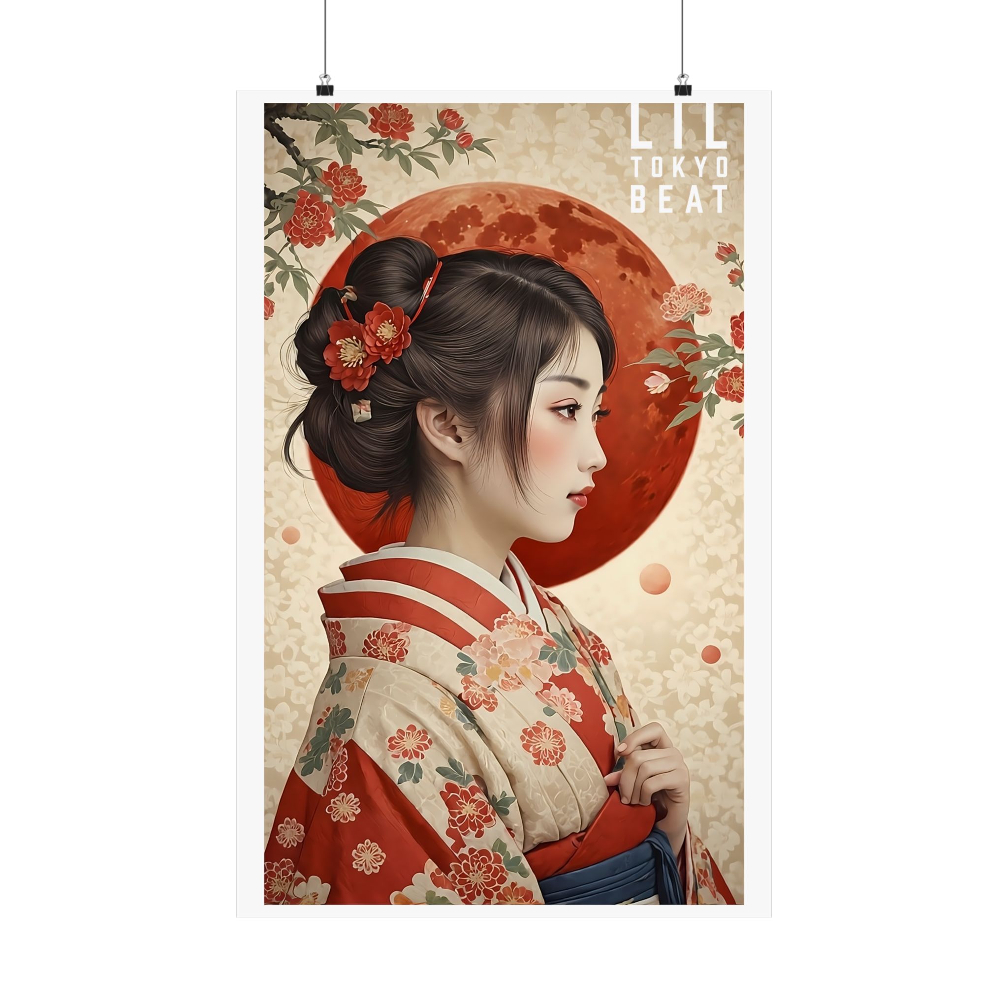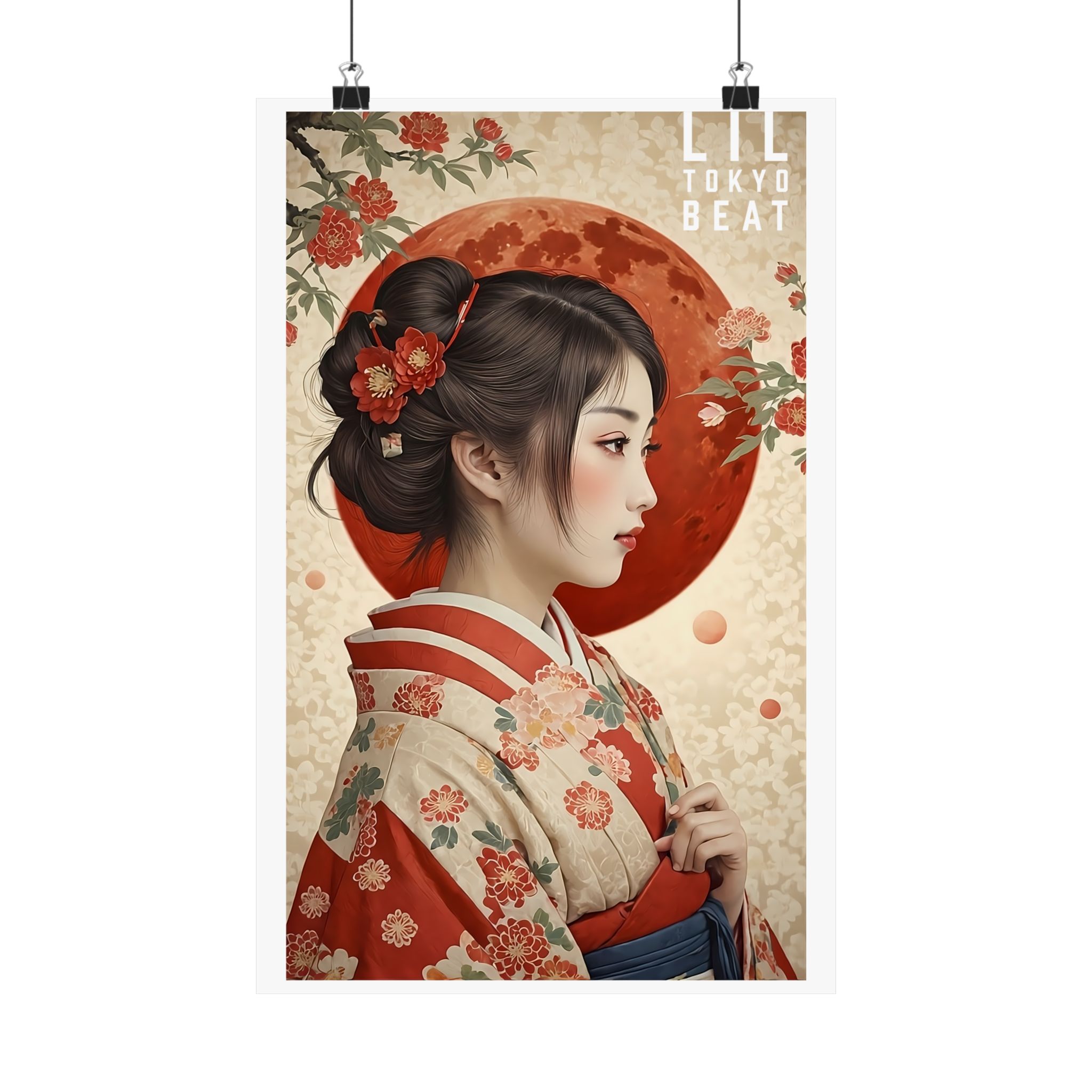 Vertical Poster, Japanese Woman Kimono: Red Moon & Floral Wall Art, Matte Print Home Decor, Asian Artwork, Unique Wall Hanging, Boho Chic
