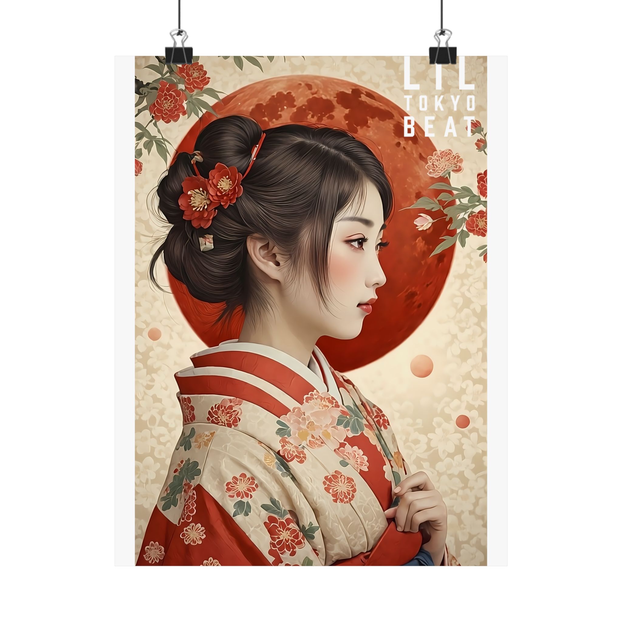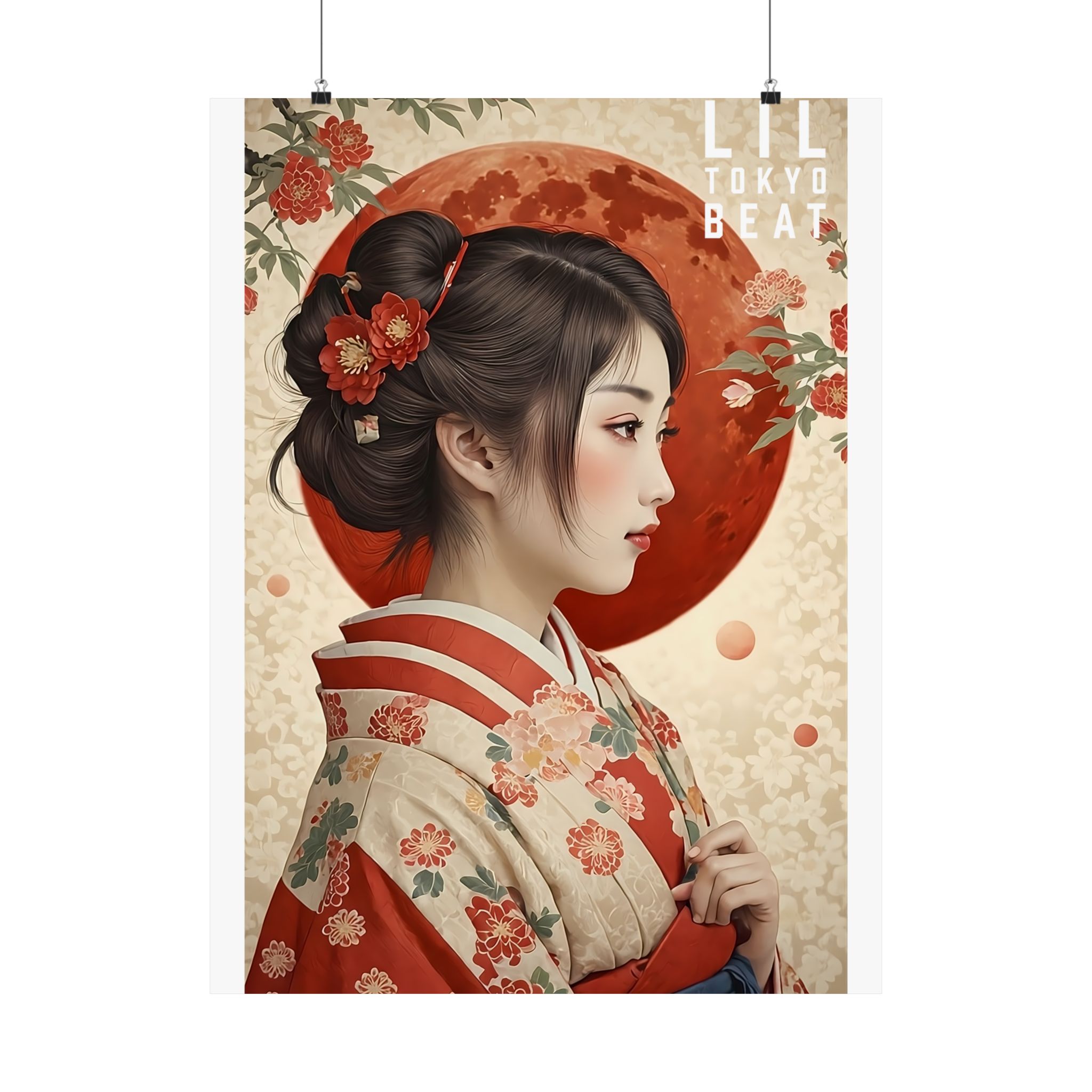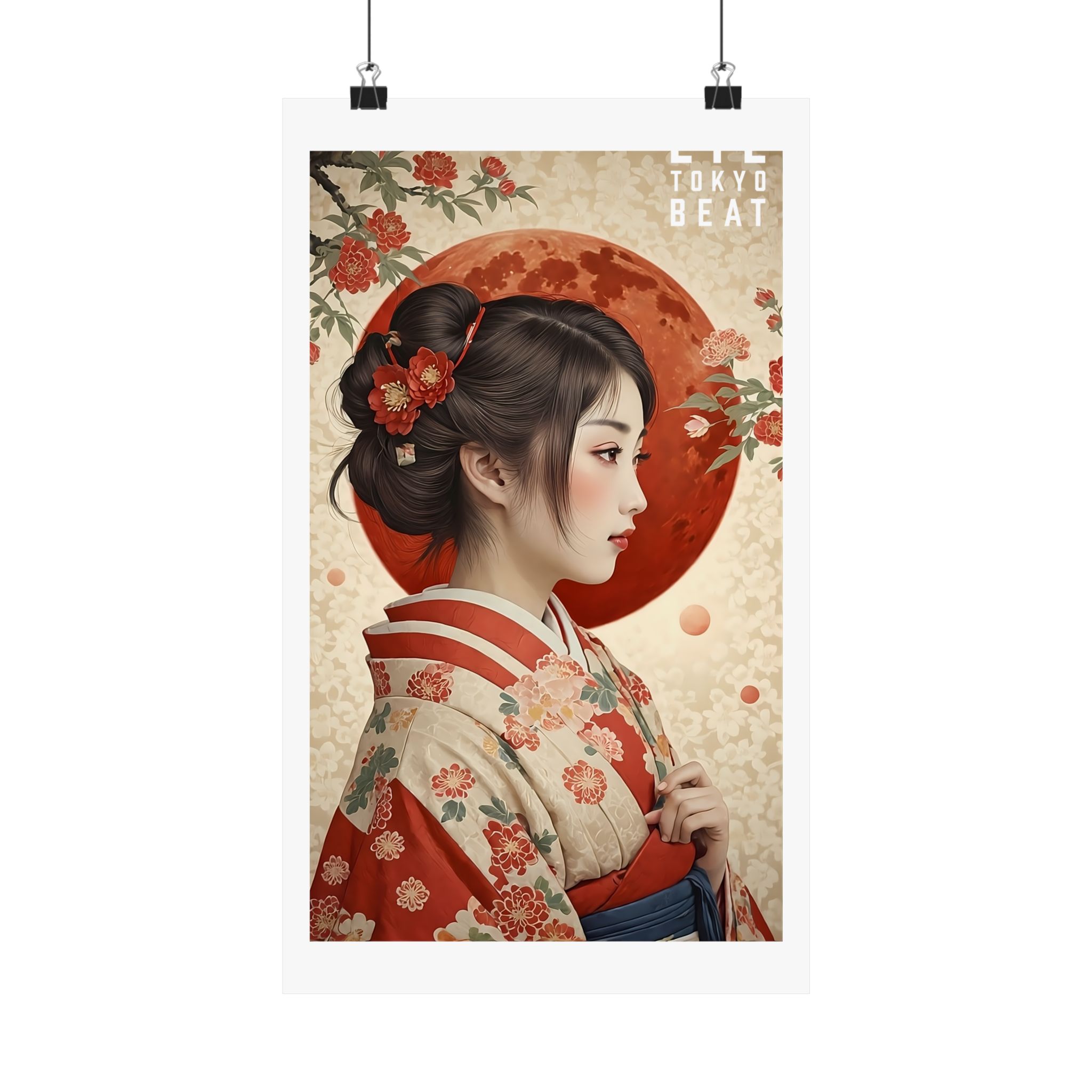 Vertical Poster, Japanese Woman Kimono: Red Moon & Floral Wall Art, Matte Print Home Decor, Asian Artwork, Unique Wall Hanging, Boho Chic