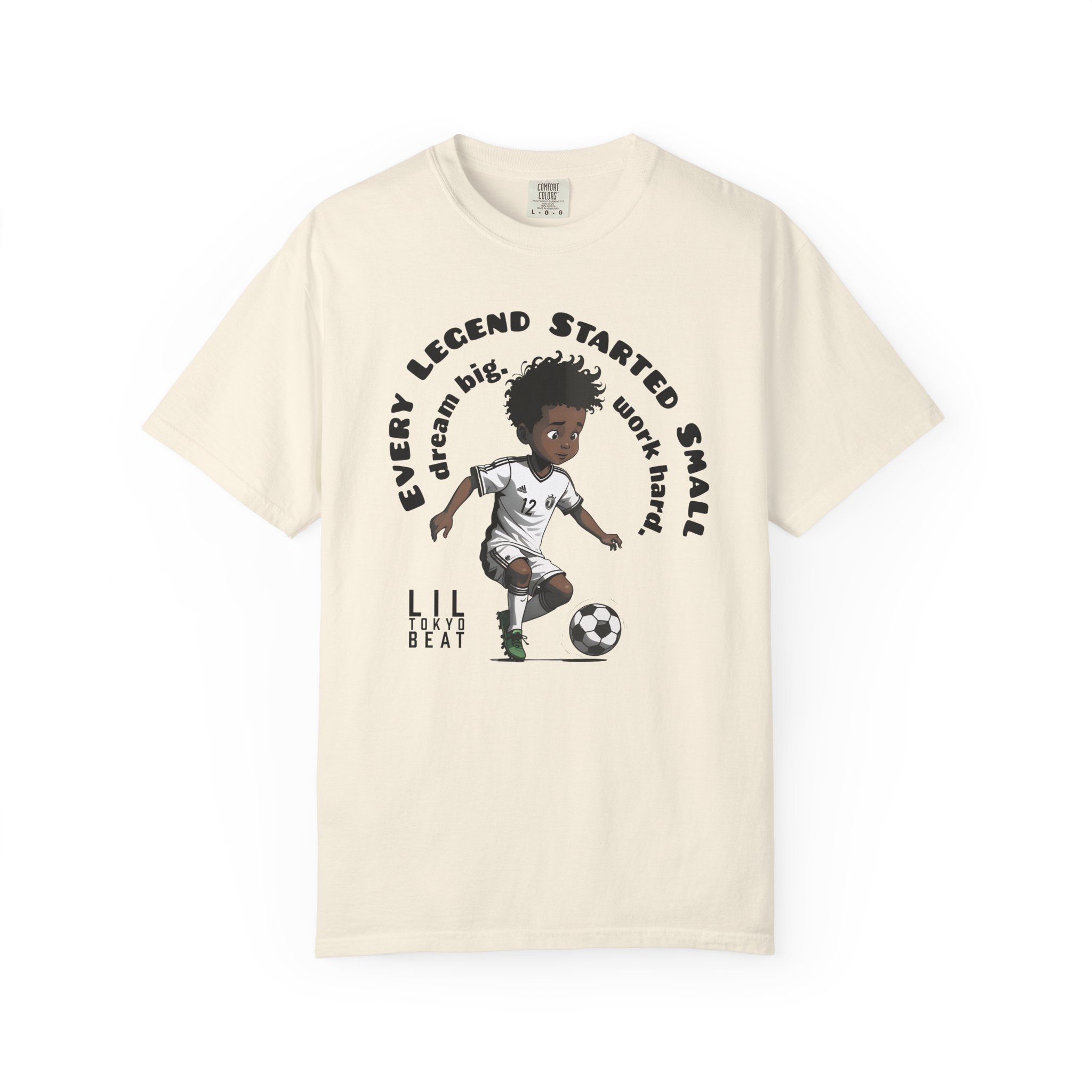 A soft, garment-dyed tee with a playful illustrated design of a young soccer player and an inspiring arc of text. Lightweight but sturdy, it carries a lived-in color and texture that feels familiar from the first wear. The relaxed cut lets kids move freely on the field or around town, while double-needle stitching and tubular knit construction keep the shirt looking good through endless washes and practices. This tee sits comfortably between sporty and casual — a keepsake piece that celebrates small beginnings, big dreams, and daily grit.